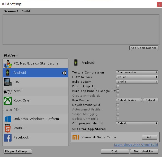 File > Build Settings > Android를 누른다. 만약, Android module이 다운로드되어 있지 않다면 다운로드 해준다.