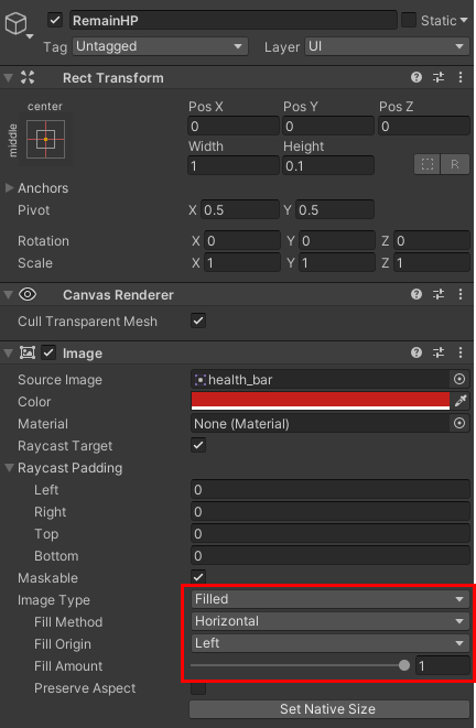 1. HP bar로 만들 이미지를 Inspector 창에 띄운 후, Texture Type을 Sprite(2D and UI)로 변경한다.
