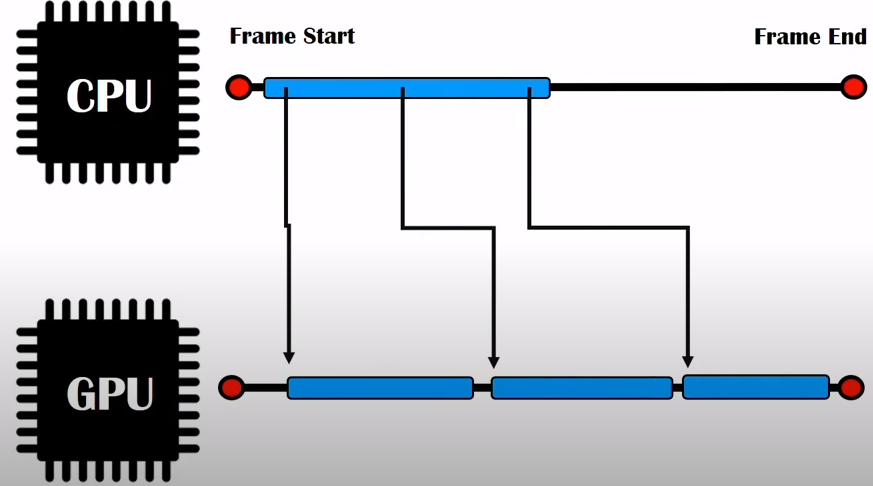 한 프레임이 시작되면 CPU가 일을 시작한다. 그러다가 그릴게 생기면 GPU에게 명령을 던진다. 그리고 CPU는 GPU가 작업을 끝낼 때까지 기다리는 것이 아니라 CPU는 CPU대로 GPU는 GPU대로 일을 진행한다. 즉, CPU와 GPU는 병렬적으로 일을 처리한다. 또한, CPU와 GPU가 해당 프레임에 해야할 일을 모두 끝냈을 시, 프레임이 종료된다. 따라서 CPU가 자신의 일을 끝내고 GPU의 작업을 기다리게 된다면 GPU의 병목이 크다는 이야기이므로 이를 제거해야 한다. (만약 이런 현상이 발생할 시, Unity Profiler는 Graphics.Blit / Device.Present를 띄운다.) 이런 GPU 병목이 발생하지 않도록 CPU와 GPU상의 밸런스를 맞추는 것이 중요하다.